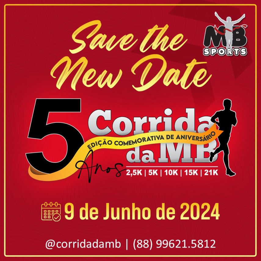 A Prova de atletismo 5ª CORRIDA DA MB, será realizada com largada e chegada em frente ao Jean da Picanha - Av. Maria da Conceição Pontes de Azevedo, 605 - Várzea Grande - Sobral, doravante denominado evento, será realizada no dia 09 de junho de 2024, na cidade de Sobral - CE, com participação de PESSOAS DE AMBOS OS SEXOS devidamente inscritas, doravante denominados atletas, com qualquer condição climática, nas distâncias de 2,5 Km, 5 Km, 10 Km, 15 Km e 21 Km.